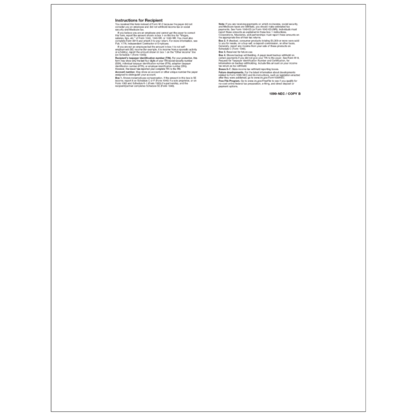NEC5173 Blank 3up 1099-NEC - 50 Pack SKU: NEC5173 $19.72 Prior Job# Special Instructions Logo & Options : $0 - Color Logo $68 - Black Logo $90 - Color Logo No Charge - 1 Color Logo No Charge - Black Logo Quantity -+ Please select options before adding to cart Add to Cart Add to Cart